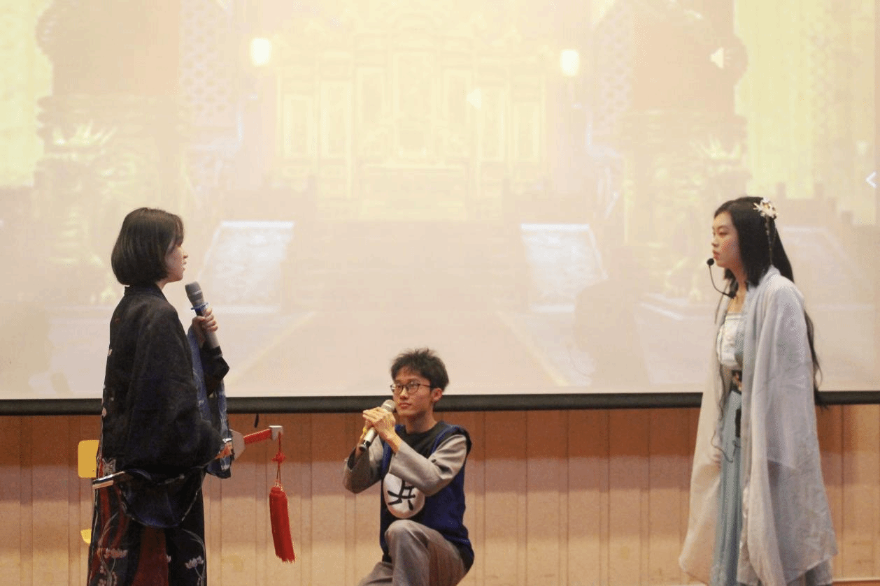 在艺教部表演队的舞台剧《新荆轲刺秦王》中,荆轲不再是一个满腔热血的勇士,而是一个机敏活泼的少女,秦王也化身为恣意洒脱的少年。引人入胜的情节,诙谐逗趣的台词,引得现场观众捧腹大笑。