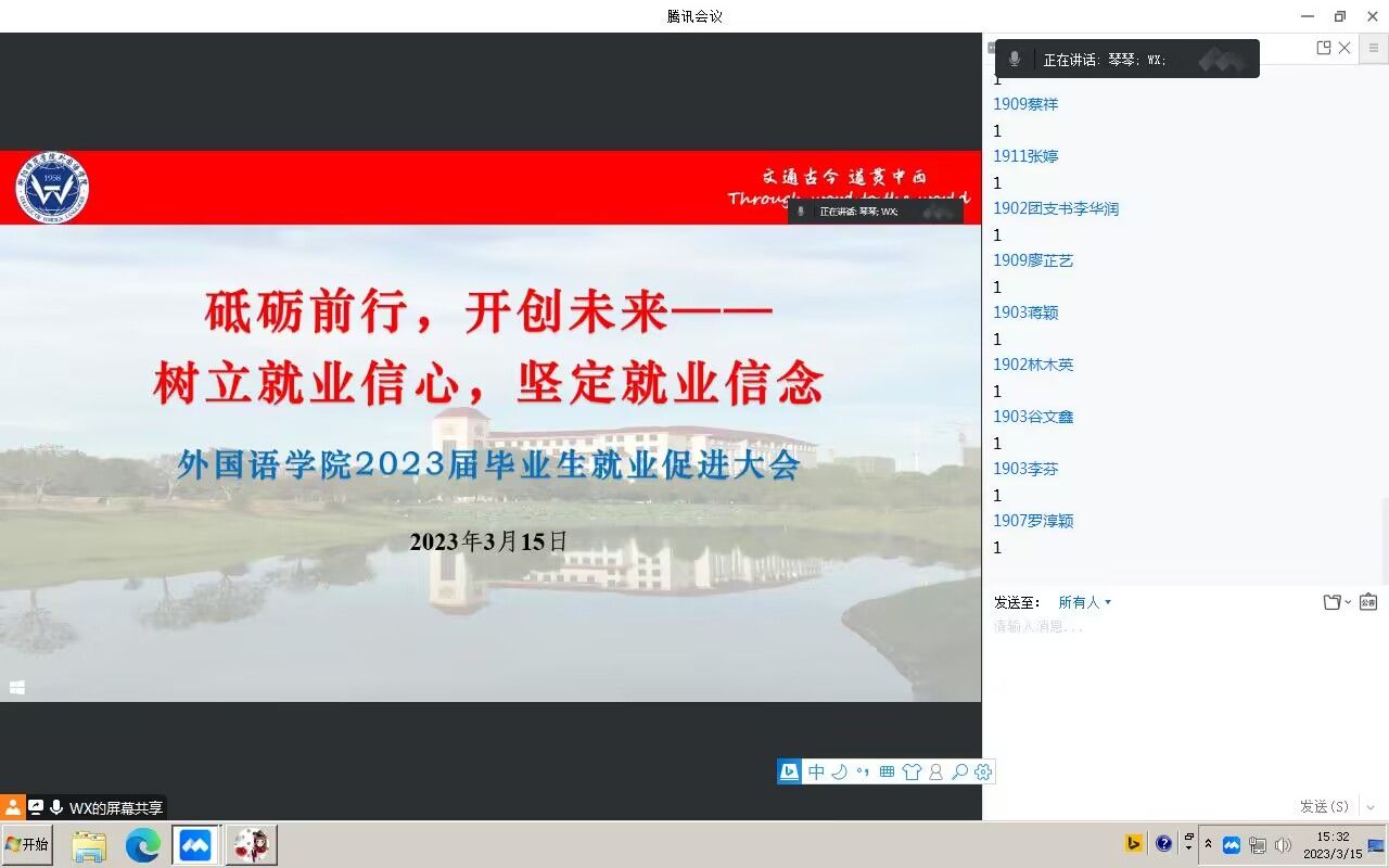 为充分调动毕业生就业积极性,帮助毕业生了解就业形势及就业政策,做好就业指导工作,提高毕业生就业竞争力和就业质量,3月15日下午,我们召开2023届毕业生就业线上促进会。必威betway平台党总支书记贺琴琴、副书记欧阳竹、就业专干邱国周以及2023届全体毕业生参加了本次会议,会议由欧阳竹主持。