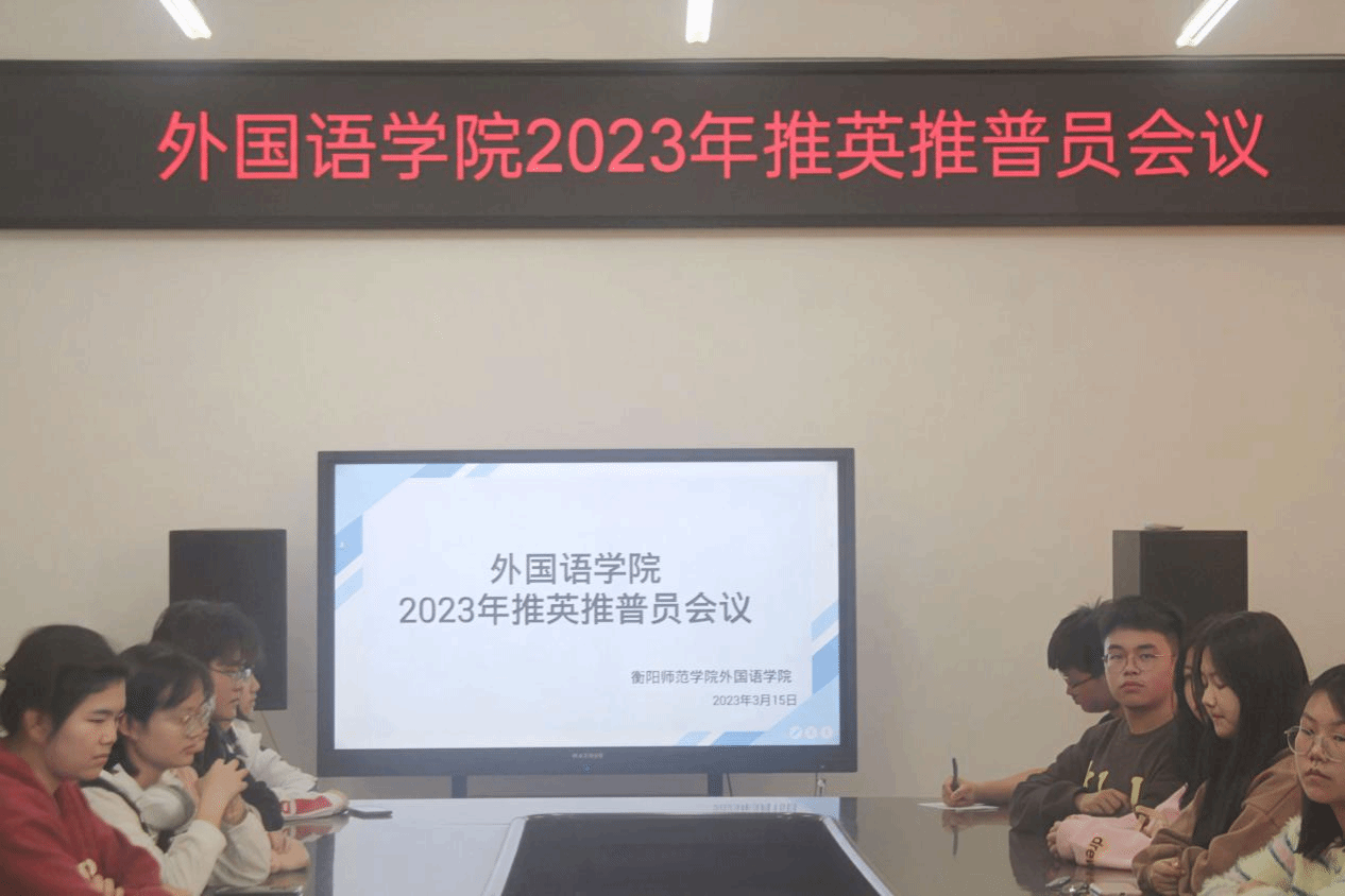 为提升学生英语口语和普通话水平,提高其学科素养和综合素质,营造浓厚的学习氛围,我们于3月15日13:00在外南213会议室召开2023年推英推普员会议。院党总支书记贺琴琴出席会议,2021和2022级全体推英推普员参加会议,会议由辅导员刘志伟主持。
