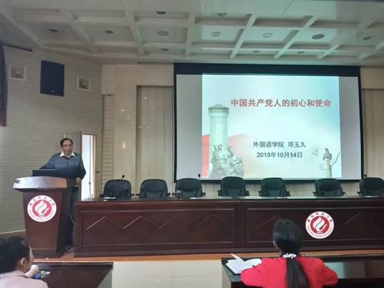 10月14日下午3点,必威betway平台组织全体教师于外北311会议室进行“不忘初心,牢记使命”主题教育专题党课学习。本次党课的主讲人是党总支书记邓玉久,题目是《中国共产党人的初心和使命》。