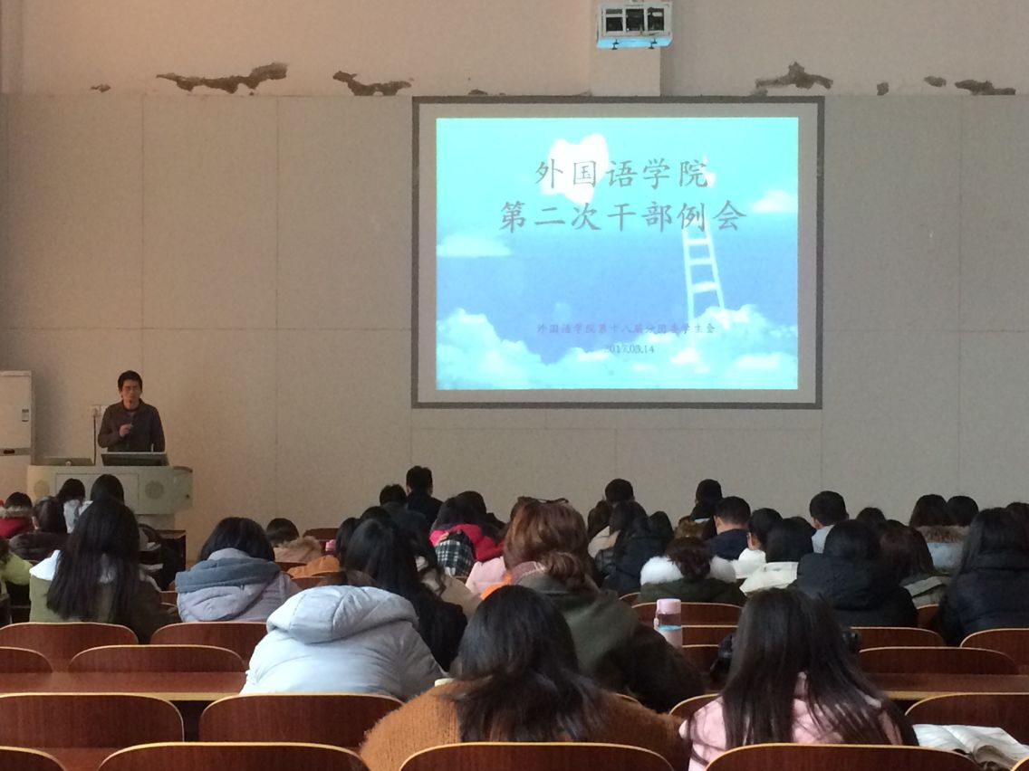 最后贺书记从现阶段外院学生口语不突出,胆量小这一现象进行分析。她特别鼓励在座的16级学生干部起带头模范作用,练习口语日常化,并带动同学们积极参与“英语吧”活动,提升自身的综合能力水平。她指出,要抓住一切学习的机会,说好、讲好英语,彰显外院的风范。