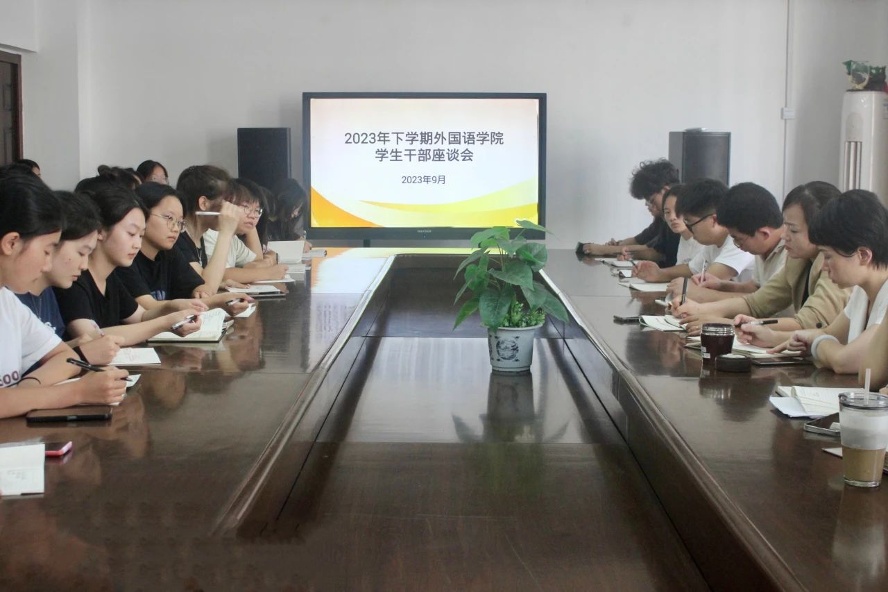 为总结开学以来相关工作,促进学生干部之间的交流,着力打造有作为、敢担当、讲奉献的学生干部队伍,切实提高我们学生管理工作和服务水平,9月25日下午,学院于外语楼南213会议室召开2023年下学期学生干部座谈会。党总支书记贺琴琴、副书记欧阳竹、学工办主任邱国周、辅导员老师龚晨阳、陈琴、刘志伟出席本次会议,院25届学生会、分团委全体学生干部参加会议。会议由欧阳竹主持。