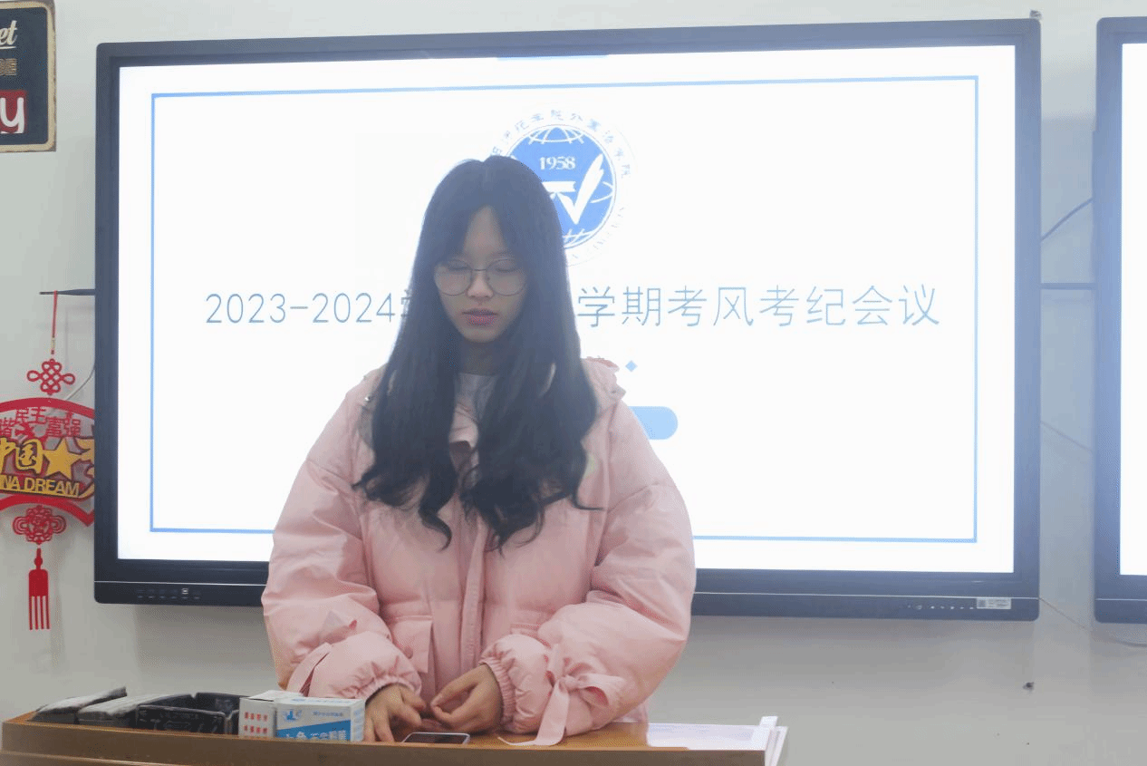 随后,学风建设部副部长张曼具体介绍了期末考试的相关注意事项,号召同学们自觉成为“诚信考试”的维护者、“维护公平”的促进者。张曼热情地与在场同学分享自己的学习方法并提出一些合理建议,提醒同学们要明确自我定位,端正学习态度,把握好复习时间,严肃考风考纪,做到诚信参考。鼓励同学们自觉抵制有损个人与班级形象的行为,做校规校纪的遵守者和维护者。