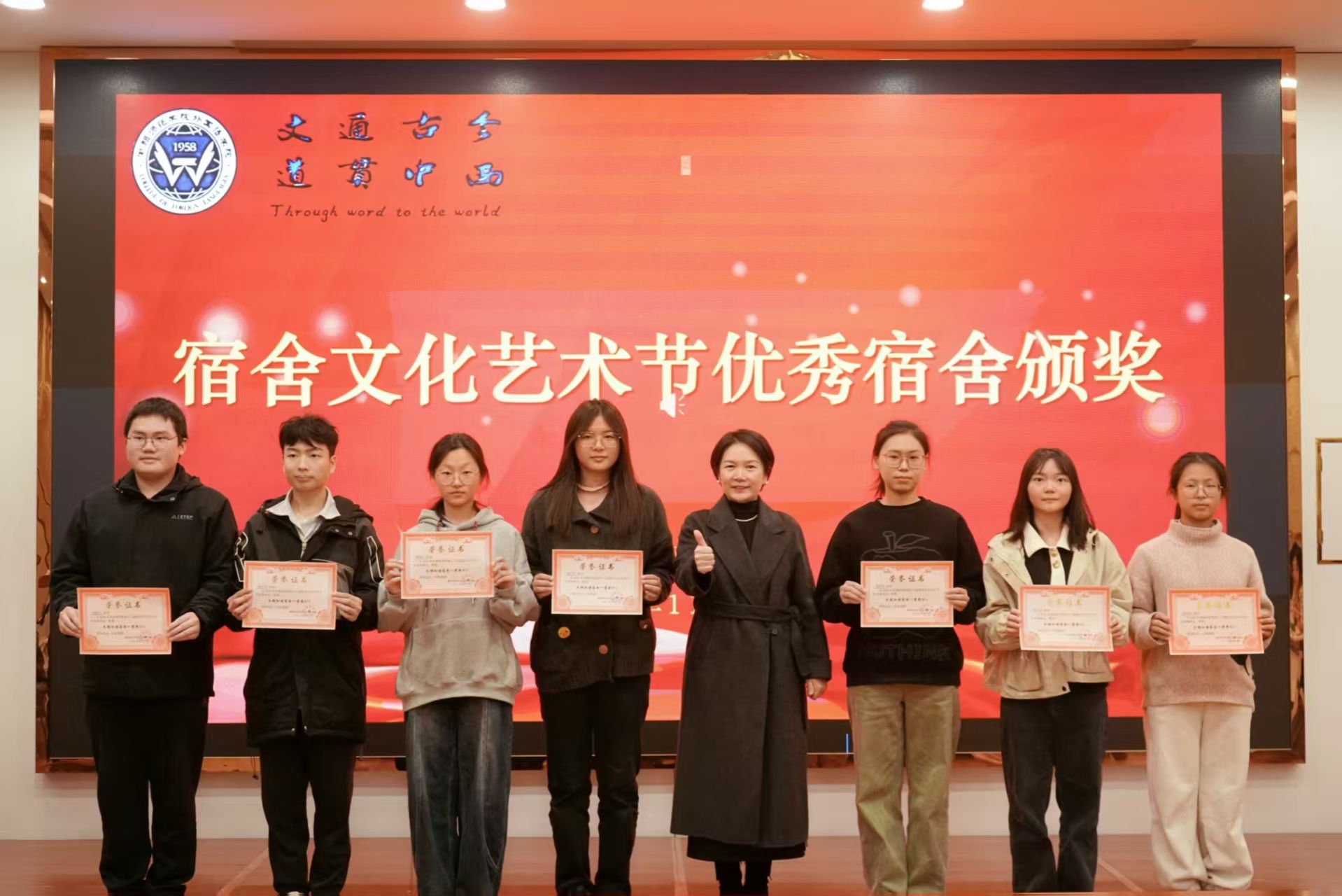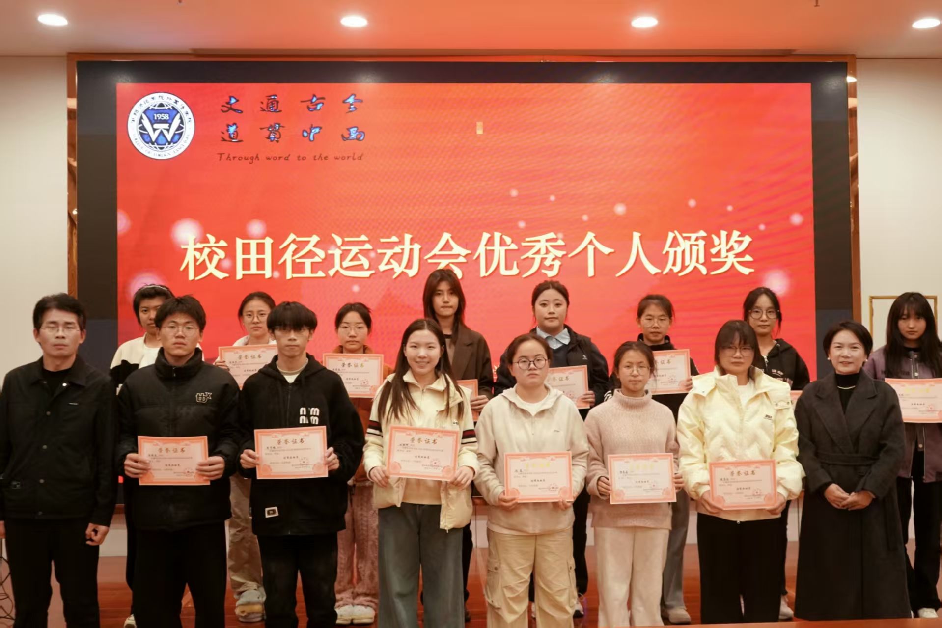 随后,betway必威领导、辅导员依次为优秀班级、四型宿舍、优秀宿舍、校田径运动会优秀工作者、优秀运动员颁奖、祝贺,并合影留念。