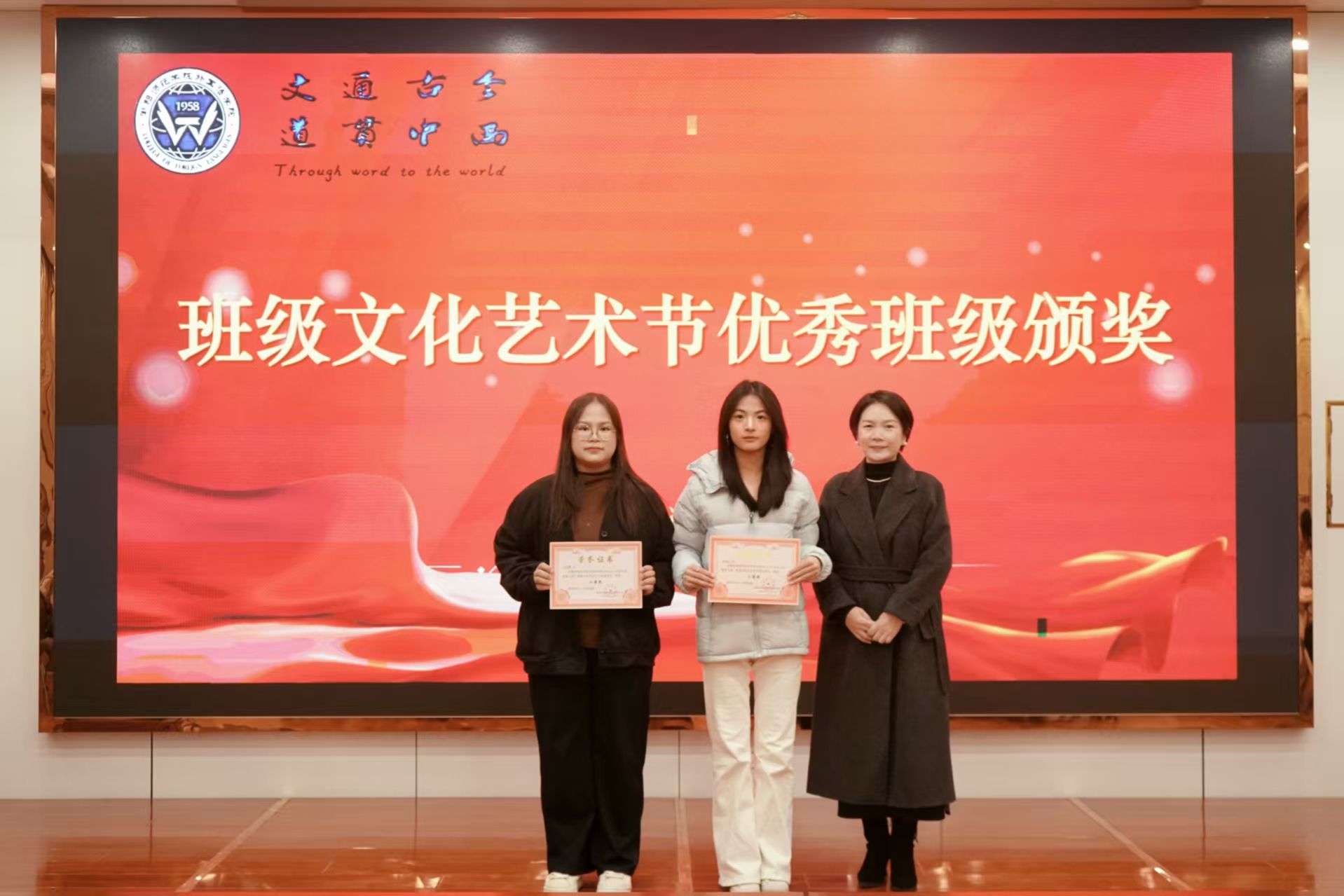 随后,活动进入优秀代表发言环节。班级文化艺术节获奖代表2025级英语4班杨语嫣以班级文化建设理念为核心,分享了班级在文化营造中的探索与收获;宿舍文化艺术节获奖代表2023级商务英语1班唐玮用细腻的讲述勾勒出室友间互帮互助、温暖相伴的点滴日常,传递出宿舍大家庭的温馨氛围;校田径运动会优秀运动员代表2025级商务英语2班王佳琪带领大家重温了运动会赛场上奋力拼搏、突破自我的精彩瞬间,展现了青春昂扬的运动风采。