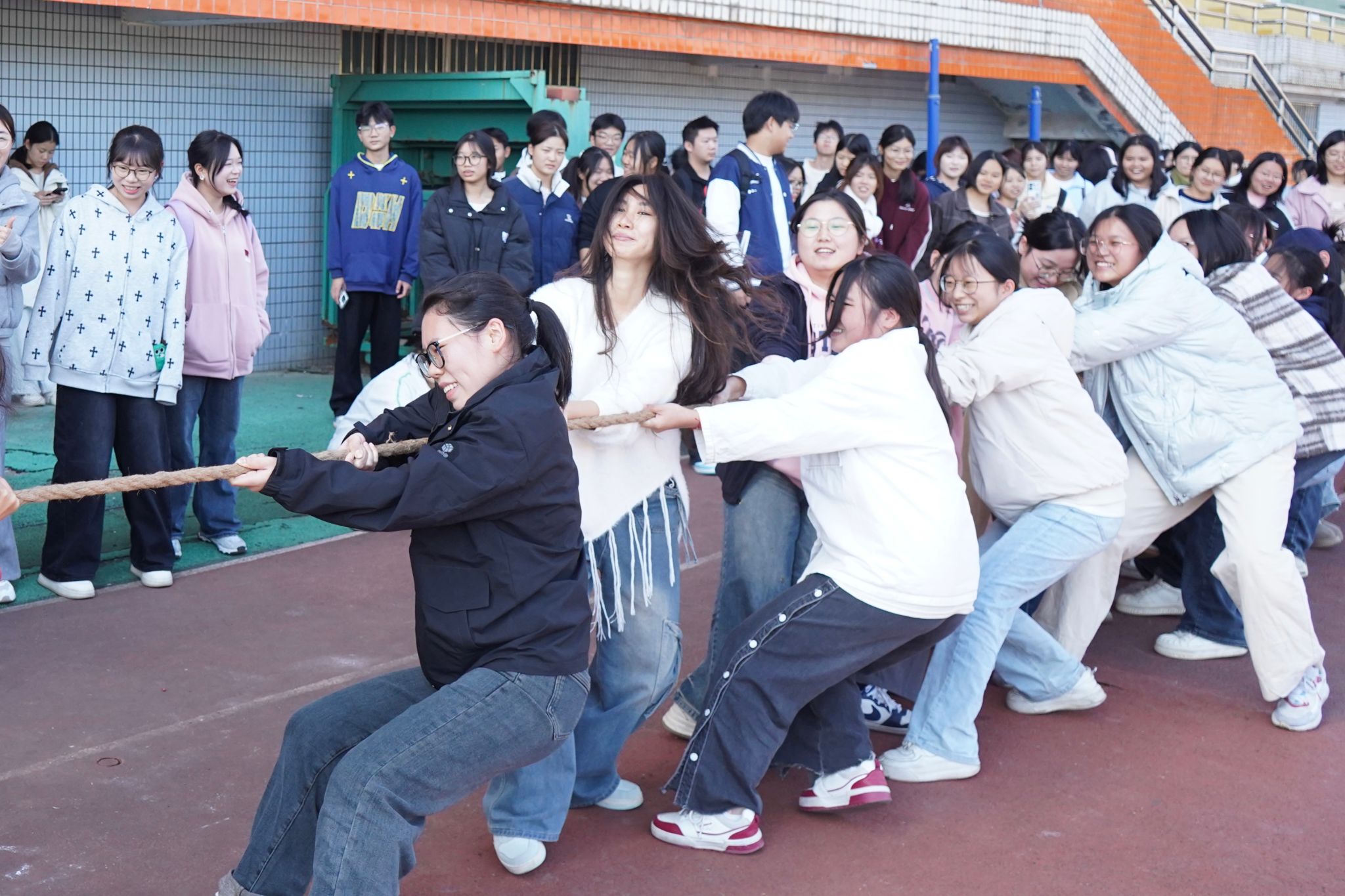 11月28日中午,赛事热度再攀高峰,更为激烈的半决赛正式打响。历经初赛锤炼的13支晋级队伍,早已凝聚起更强的团队合力。他们肩负着班级的期许,怀揣着青春热血,在拔河道上展开巅峰对决,凭借默契配合与坚韧意志,全力向7强席位发起冲击。