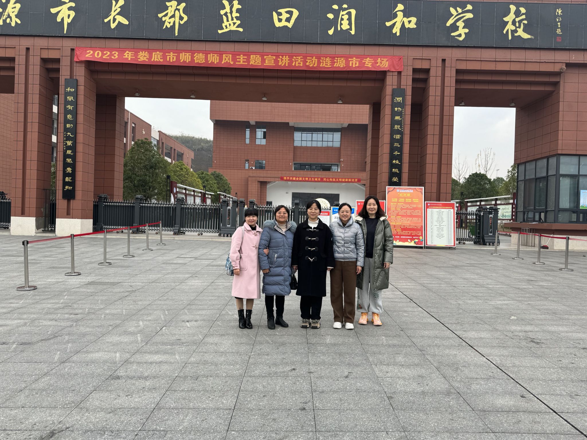 在涟源蓝田中学,谢院长一行同实习生李美思、实习指导教师郭校长、谢老师进行了深入交谈,并听取了李美思同学的汇报课。