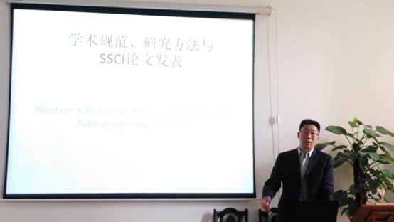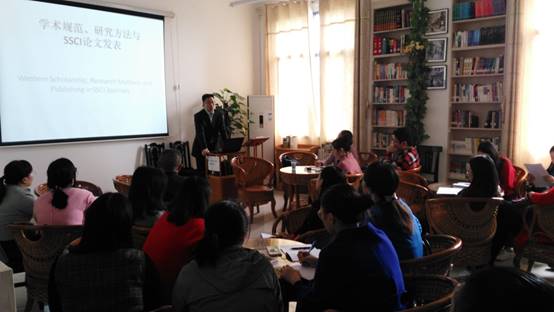李教授首先回顾了自己的学术经历,用图表形式展示了中西学术规范的区别,指出了中国学者用英文撰写论文存在的问题,强调对待学术必须严谨,不论在研究内容还是写作方法上面都要注重质量,要着眼于“国际视野、中国特色”,并提出“善用中式视角、重视实证数据”这一可行性建议。他还对比分析了国际著名期刊索引数据库SSCI与A&HCI的权威地位以及两者之间的异同,还从SSCI收录期刊审稿人的角度出发,具体说明了此类期刊审稿的流程与标准,提出了论文撰写的要点和基本框架。李德凤教授鼓励大家做研究要持之以恒,他认为只要努力最后一定会有所收获。