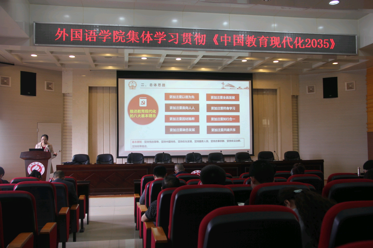 此次会议旨在进一步提高教师对于《中国教育现代化2035》的人事,并且要求各位教师以此为指导努力奋斗,争取为学生提供一流的、高质量的高等教育,为实现中华民族伟大复兴的中国梦贡献力量。